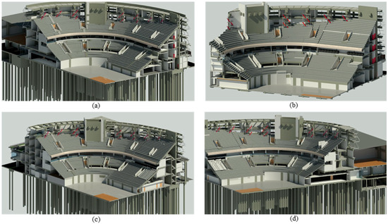The Indoor Multifunction Stadium of Senayan as one of the mega infrastructures in Indonesia was chosen as a study case. It features an elliptical architectural style with a relatively tall five-story building, spanning 65,888.52 m2. It can accommodate up to 100,000 spectators. The upper structures of the stadium employ a wide-span concrete framework, while the roof structure utilizes a steel structure with an anchoring system. The stadium’s construction has four zones, as shown in Figure 5.