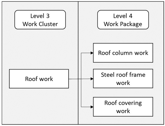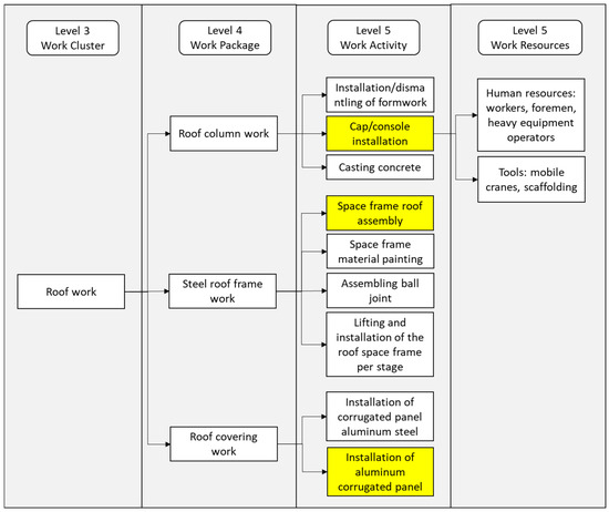 The construction activities in the four zones of the stadium project were concurrently executed in accordance with the established Work Breakdown Structure (WBS). The Work Breakdown Structure (WBS) is an organized hierarchy of tasks and levels that outlines the project’s progression according to the timeline established by the project manager [34]. The WBS, which consists of six levels (project name, work phase, work cluster, work package, work activity, and resources), is commonly used in the Indonesian construction industry. Figure 6 depicts the WBS from level 3 to level 4, focusing on the roof work cluster. Within this stadium project, the roof works cluster in the WBS comprises three main work packages: roof column work, steel roof frame work, and roof covering work.
