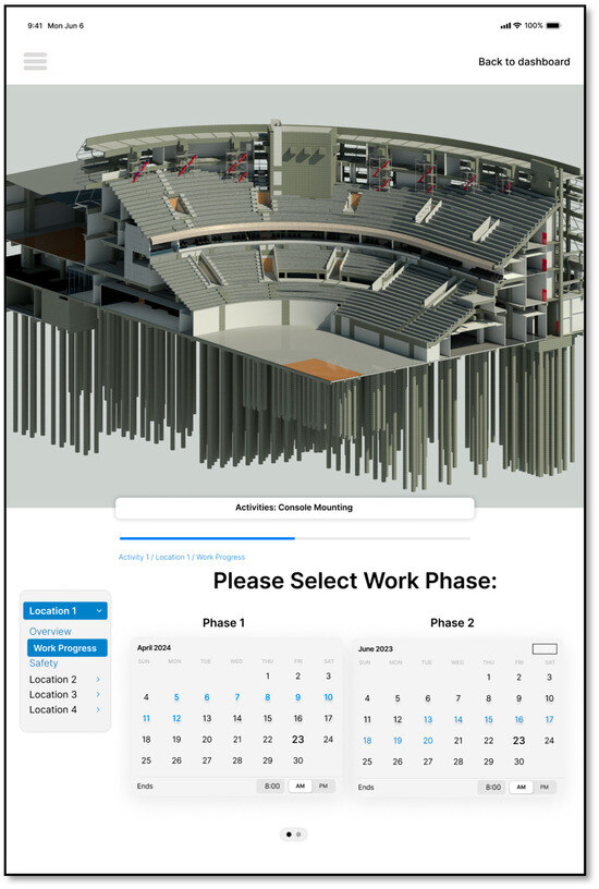 The dashboard is developed using Figma, a collaborative web application for interface design. As users open the dashboard, users can choose the work activity, as shown in Figure 3a. After clicking on one of the work activities, users are directed to a page dedicated to presenting a 4D BIM model and safety knowledge of the chosen work activity. A visualization of the BIM model is presented at the top of the page and the safety knowledge buttons are at the below section of the page, as shown in Figure 3b. On the left bar of the below section, users can click the location where they want to specifically check the “overview”, “work progress”, and “safety knowledge” of the chosen work activity.