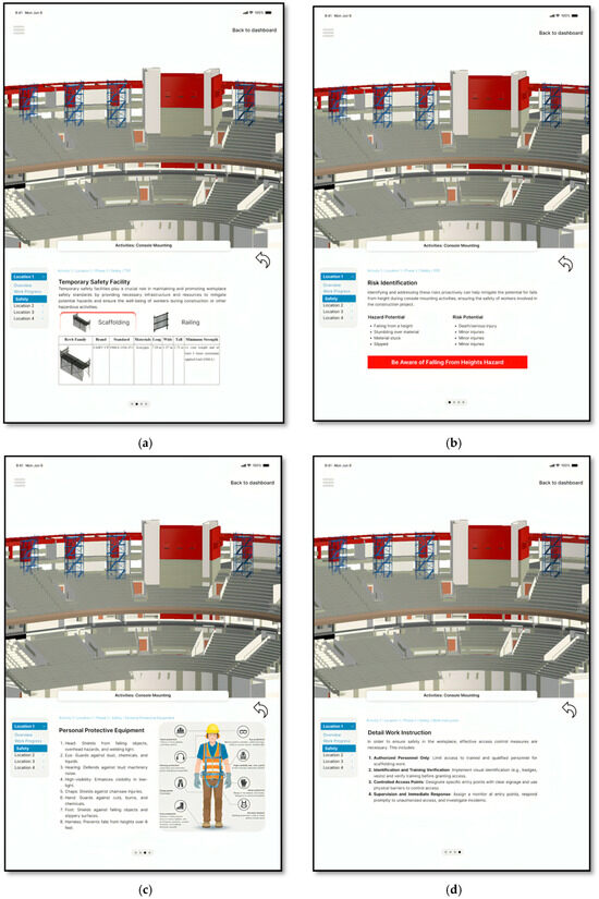 The safety knowledge tabs of the dashboard for console mounting activity: (a) identified risk; (b) temporary safety facility; (c) PPE; (d) safety work instructions.