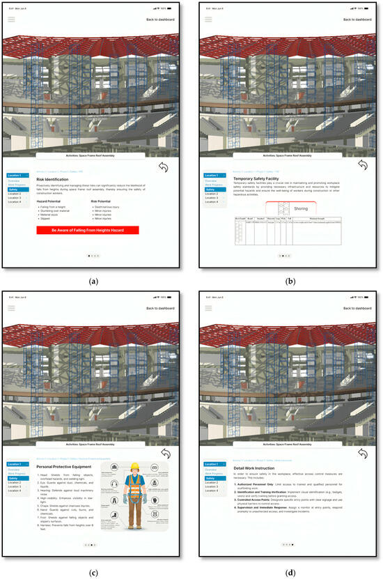 Figure 10 shows how the dashboard shows different safety knowledge following the tab being clicked by the dashboard users. Figure 10a provides information that there are at least four potential hazards and the potential risk for the console mounting activity in Phase 1 in work location Zone A. One of the potential hazards is falling from height with a potential risk of death/serious injury. Regarding the TSFs, dashboard users will know that the TSFs that must be installed before carrying out the work are safety fences and scaffolding (Figure 10b). The specification of the TSFs is listed in the dashboard in detail. Lastly, dashboard users can further click the tab of “PPE” to obtain details of the PPE that workers must use and the tab of “safety work instruction” to understand the work instructions that must be strictly followed, as shown in Figure 10c and Figure 10d, respectively.