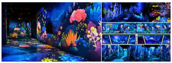 The “Time Tunnel”, over 250 m long, is located east of Fucai Gate in Qingzhou Ancient City (Figure 1). It is an immersive digital cultural art experience hall that uses the city wall buildings of Qingzhou Ancient City as the display space, combining advanced computer graphics technology to showcase the natural, historical, and cultural features of Qingzhou (Figure 2). Here, visitors can experience historical changes in Qingzhou Ancient City; appreciate cultural symbols such as Buddha statues, ancient paintings, carp, and cranes; and interact with virtual scenes to enjoy the charm of digital cultural tourism. The experimental materials used in this experiment are actual built projects designed by transforming architectural spaces.