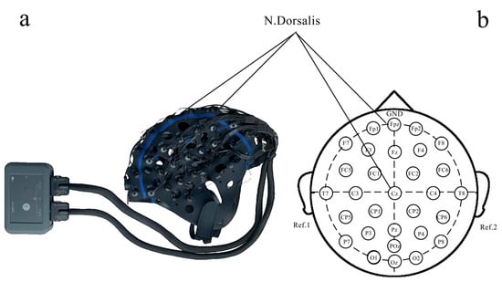 Considering these points, this study selected the Smart BCI portable EEG collection device as the EEG test equipment, with a sampling rate set at 500 Hz. The device has 32 metal electrodes corresponding to 32 standard points in the 10–20 system formulated by the International Society of Electroencephalography, with Cz as the reference electrode (Figure 3).