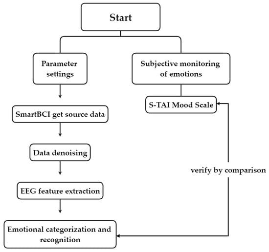 This experiment explores gender differences in emotional responses in specific architectural environments to optimize digital cultural tourism project designs. Based on the immersive experience of the “Time Tunnel” in Qingzhou Ancient City, Smart BCI portable EEG collection devices were used to record the EEG data. The EEG signal processing framework was employed to remove artifact EEG signals. The processed EEG signals were combined with the bipolar dimensional emotional model to quantify emotional states. Through baseline emotional surveys and EEG data measurements in VR environments, the emotional responses of different genders were studied. The specific experimental flow is shown in Figure 4.