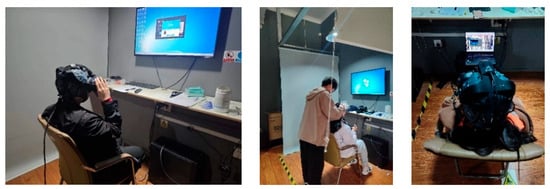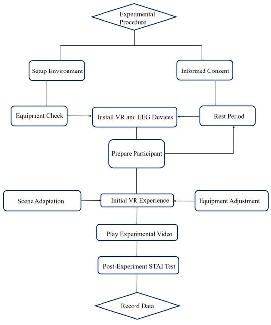 The overall experimental flow was linearly structured (Figure 5), with participants performing the experiment under appropriate lighting conditions. Throughout the experiment, the stability and controllability of the environment were maintained through a constant temperature and humidity air-conditioning system, minimizing external interferences to ensure quiet and comfort. Participants then signed informed consent forms, and their information was collected. They were given approximately 5 min to sit quietly and rest to ensure they were in optimal condition for the experiment. During the experiment, it was necessary to ensure that the equipment had sufficient power to maintain measurement stability. Next, VR equipment and EEG devices were installed, worn, and calibrated. The process of wearing the EEG devices was explained to the participants to ensure their comfort. Conductive paste was applied thoroughly into the electrode holes to ensure contact with the scalp and increase conductivity; participants were instructed to wash and dry their hair to avoid the impact of oils and skin residues on the measurements. Finally, participants were required to sit quietly on a chair, minimizing unnecessary movements and avoiding eye and muscle activity to reduce interference artifacts, ensuring the accuracy and stability of the measurements. After the preparation process, participants from different gender groups first experienced the VR environment for a certain period. After calming down, their initial EEG data were recorded. Participants were then given 10 min to complete the STAI test to obtain a baseline of their psychological state, providing a subjective evaluation of their psychological state changes before and after the experiment.