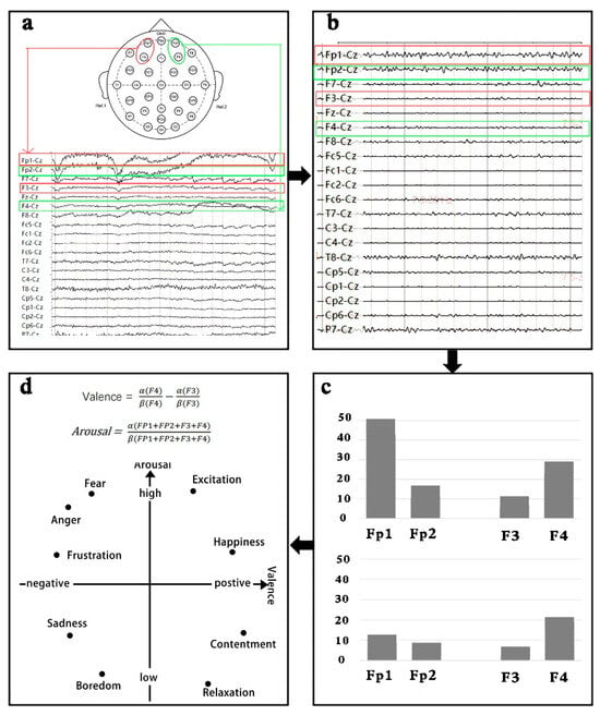 Data processing flow: (a) collecting time-series EEG data; (b) removing signal artifacts in EEG data; (c) measuring mean PSD at the frontal area; and (d) emotion identification by calculating valence and arousal levels using the frontal area mean PSD.