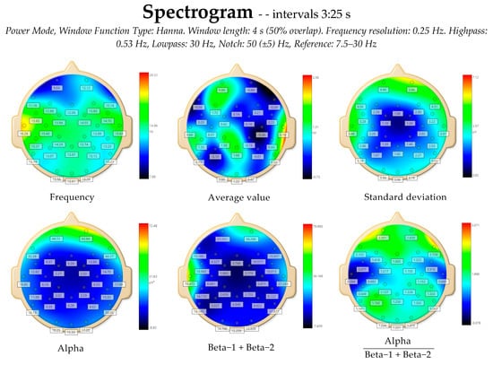 Among the various methods for measuring individual emotions, the frontal EEG asymmetry (FEA) method, based on power spectral features, has been widely adopted in academic research [,,,]. This method utilizes the activities of the left and right frontal lobes for emotional measurement, as the frontal lobes are known as the emotional control center. Positive emotions enhance left frontal lobe activity, whereas the right frontal lobe is typically associated with negative and avoidance emotions [,]. Therefore, this study calculated the power spectral density (PSD) in the α and β frequency ranges for the left and right frontal lobes using the FEA method, which displayed the activation levels of both frontal regions, thereby visualizing the individual’s emotional state (i.e., valence) []. Additionally, by calculating the power ratio in the α and β frequency ranges using the FEA method, the α frequency is more prominent in positive states, while the β frequency range is associated with individual arousal. Consequently, the power ratio visualizes the individual’s arousal state []. To accurately assess emotion and arousal in this study, the following four channels in the frontal region were selected: electrodes FP1 and F3 on the left frontal lobe; and FP2 and F4 on the right frontal lobe. After obtaining the initial EEG data from the frontal region, the relevant signal artifacts were processed, and the average PSD values in the α and β frequency ranges were calculated using the FEA method.
