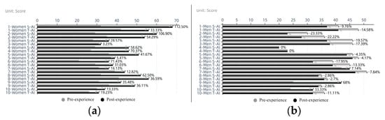 Through the subjective S-TAI evaluations completed by participants before and after the experiment, their emotional changes were analyzed and cross-referenced with the physiological measurement data. The S-TAI emotion scale data before and after the experiment show that for the 10 female participants, both the S-AI (State Anxiety Inventory) and T-AI (Trait Anxiety Inventory) scores significantly increased (Figure 9a), indicating a certain level of tension and anxiety overall. In contrast, the changes in S-AI and T-AI scores for the 10 male participants were minimal (Figure 9b), suggesting that their emotions remained stable, demonstrating minor emotional fluctuations before and after the tour.