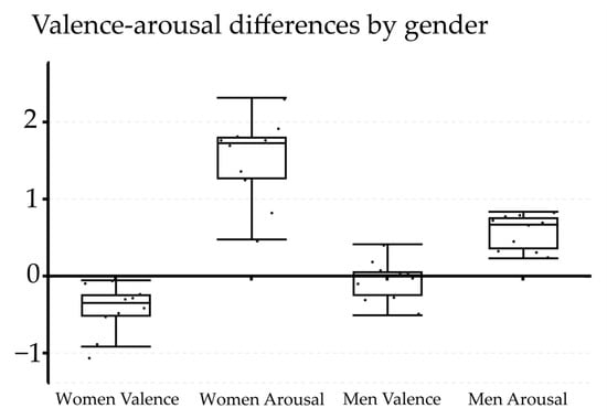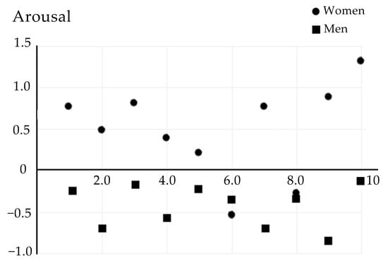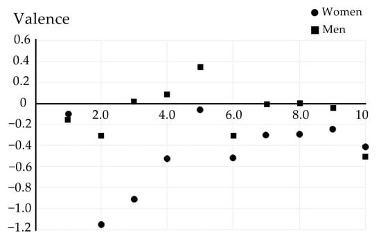 The summary of EEG data highlights the changes in average emotion and arousal levels for males and females. When average valence and arousal levels are situated at the bipolar dimensions of emotions, different emotional states under gender conditions can be inferred. During the tour, five male participants exhibited more positive emotions such as comfort, relaxation, and satisfaction, indicated by a valence greater than 0. The remaining five male participants’ valence values were closer to 0 compared to the female participants (Figure 10). On the other hand, all 10 female participants showed valence values below 0, with 8 females displaying arousal values greater than 0 (Figure 11), indicating a significant difference to the levels observed in the males, reflecting possible negative emotions such as tension, stress, and anxiety. Between the two dimensions of emotion, women’s emotional levels were more susceptible to external stimuli. Under the same stimulus, the average emotion value for women was positive, whereas for men it was negative (Figure 12).
