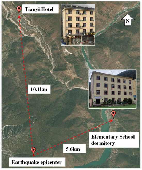 On 5 September 2022, a magnitude 6.8 earthquake struck Luding County in Ganzi Tibetan Autonomous Prefecture, Sichuan Province, primarily affecting Detuo, Moxi, and the surrounding areas, with the epicenter located near the Hailuogou Scenic Area. According to the “Code for Seismic Design of Buildings” GB 50011-2010 (2016 revision) [21], the seismic fortification intensity for Luding County in Ganzi Tibetan Autonomous Prefecture is designated as 8 degrees, with a basic design seismic acceleration of 0.2 g, classified under the second group for earthquake design. Based on field investigations, it is known that the village or town in question primarily consists of multi-story buildings. The main types of building structures found there include hybrid frame–masonry structures, masonry structures, and a small number of earthen structures, as well as frame–shear wall structures and shear wall structures. The earthquake occurred near a tourist area, where the housing structures are predominantly hybrid structures of frame–masonry. Damage was concentrated at the lower levels, particularly severe longitudinally due to the structural form and masonry materials used. The load-bearing walls at the base of the masonry structures were notably compromised. However, some masonry structures at the earthquake site showed no significant damage. To analyze the seismic damage phenomena, two buildings were selected that had similar volumes but exhibited significantly different states of damage and representativeness. One building was a hybrid structure of frame–masonry, and the other was a masonry structure. This analysis aimed to understand the variance in performance between different structural forms in the same seismic event. The two typical buildings are Tianyi Hotel, which represents hybrid frame–masonry structures, and Beitou Village Central Elementary School Dormitory (hereafter referred to as the elementary school dormitory), which represents masonry structures. The positions of the two relative to the earthquake epicenter are marked in Figure 1.
