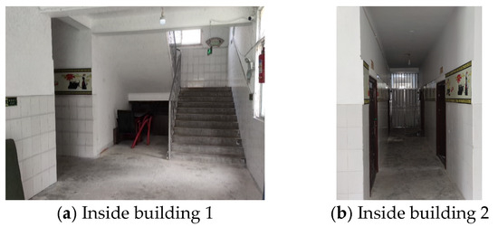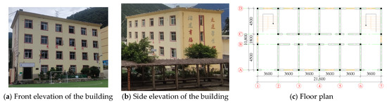 Figure 4a,b show the elementary school dormitory, a four-story building with its floor plan displayed in Figure 4c. The thickness of the building wall is 240 mm, and the height is 3600 mm. Based on the base shear method, the ground floor is subjected to the greatest earthquake shear forces, and since the layout of each floor is similar, only the ground floor is analyzed. Field surveys indicate that the building has an interior corridor-style masonry structure with well-integrated ring beams and structural columns, providing good overall integrity. Figure 4 and Figure 5 illustrate that, to meet functional needs, axes Ⓐ and Ⓓ require openings for doors and windows, which are similar in position and size. This design leads to walls between windows with small shear spans, prone to shear damage [37], although no such damage is observed in this building. The internal axes Ⓑ and Ⓒ, which have large doorways and staircases, show no apparent damage to the wall surface’s decorative layer. Despite having several fully masonry transverse walls, there is no noticeable damage; compared to the x-direction, the y-direction has greater lateral stiffness, making it less prone to y-direction displacement. Thus, the building is more likely to move along the x-direction.