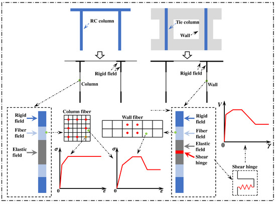 In order to obtain a macroscopic model of the study building, the corresponding numerical model was established using the numerical analysis software Perform-3D. Based on the seismic damage investigation and related tests, it was found that the bending failure of the frame column mainly occurred. The damage was mainly concentrated in the upper and lower end of the columns, and relatively serious plastic hinges had already appeared at the column ends. For the structural components of beams and columns in buildings, conventional fiber elements are sufficient for simulation. These are divided along their length into five sections: rigid zones, fiber zones, elastic zone, fiber zones, and rigid zones, and the length of the fiber zone is set as half of the long axis of the cross-section. The fiber zone cross-section consists of various steel and concrete fibers. The three-line model with certain strengthening effects is selected for the reinforcement constitutive structure [38], while the five-line model is selected for the concrete constitutive structure [39]. For masonry walls, combined observation of the earthquake damage site and test phenomenon shows that the failure mode is shear failure. In order to simulate the failure phenomenon relatively accurately, plastic shear hinge [40,41,42] is introduced into the simulation method. The shear hinge exhibits a relatively large stiffness in the initial stage and remains in an elastic state. Once the deformation reaches a certain magnitude, the load-bearing capacity of the shear hinge starts to deteriorate, and its stiffness declines. When the received shear force attains its maximum value, it signifies that the shear hinge has been severely damaged. Subsequently, the bearing capacity of the shear hinge continuously decreases. Eventually, the bearing capacity of the shear hinge becomes identical to the frictional force. For x-direction walls with openings, the stiffness of upper and lower window walls is higher than that of the walls between windows, and the upper and lower walls are set as the rigid zone. The wall between the windows is simulated by a fiber zone, elastic zone, and shear hinge. For the transverse wall, the simulation mode is the same as that for the x-direction wall, in which the masonry constitutive model is selected as a five-line model, and the required parameters of the constitutive model are adopted as suggested by Shabani [43]. Model simplification, element division, and constitutive relationships are shown in Figure 6.