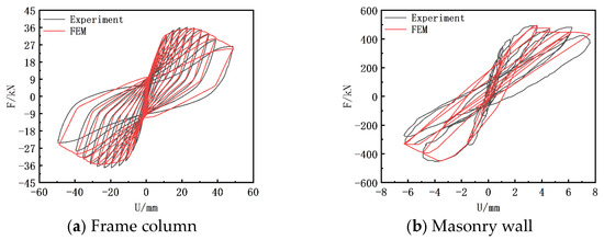 To verify the accuracy of the subsequent analysis model, experimental models from the relevant literature were selected as references. Using the aforementioned modeling techniques and finite element software, these experimental models were reconstructed. The F2 model in reference [44] is selected as the verification model for the frame part. The M1-1 model in reference [45] is selected as the verification model for the masonry load-bearing wall. As shown in Figure 7, the comparison between the experimental data and finite element analysis results shows good agreement, validating that this modeling approach is suitable for further analysis.
