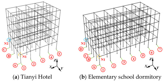 Based on the available data for Tianyi Hotel and the elementary school dormitory, numerical analysis models were established. The material data for the buildings were sourced from the referenced standards [21]. As the building materials cannot be accurately obtained, the concrete grade used for the beams and columns of the two buildings is now unified and specified as C30, and HRB400 steel reinforcement is specified for the rebars. The walls are constructed from clay bricks and corresponding mortar, with a thickness of 240 mm. Considering the walls, decorative layers, equipment, etc., the building load is calculated to be 1 t/m2 [46]. This load is then distributed to each node based on the proportion of the dependent area. The calculation model is shown in Figure 8.