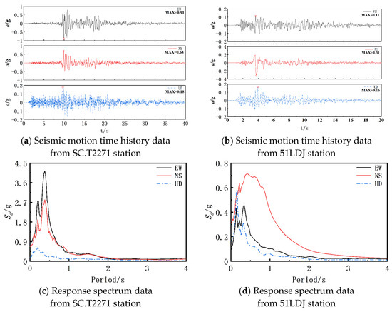 To explore the reasons for the significant differences in performance between the two buildings, seismic data from typical stations within Luding County, specifically SC.T2271 and 51LDJ, were used for the elastoplastic time–history analysis. The data were amplitude-modulated, adjusting the Peak Ground Acceleration (PGA) to 0.1 g, 0.5 g, and 1.0 g, to simulate conditions of minor earthquakes, major earthquakes, and extreme seismic events, respectively, where the buildings are located. Due to the presence of significant amounts of invalid data in the recorded station data, which would increase computational costs and reduce efficiency, the data were truncated. This truncation considered a response spectrum tolerance value of ≤0.01 before and after the truncation. The processed station data are illustrated in Figure 9 and Table 1.