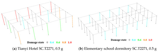 As discussed in Section 1, the damage to the buildings is primarily concentrated on the ground floor; a pattern also evident in the numerical analysis models. To clearly display the model’s damage state, only the ground floor is shown. To examine the damage state and sequence of the components along each axis, this paper defines masonry wall shear strain and steel yielding as the performance points for walls and concrete beams/columns, respectively. Using a model subjected to a PGA = 0.5 g earthquake as an example, the plastic state of the two models is extracted at the moment when a specific axis reaches its maximum performance point. As shown in Figure 10, in Tianyi Hotel, the model’s x-axis lines all exhibit varying degrees of damage. For the y-direction load-bearing components, only component B5 reaches 80% of the wall’s performance point shear strain, while the other y-direction components largely remain in the elastic stage. In the elementary school dormitory, only some vertical load-bearing components along axes Ⓐ and Ⓓ reach 40% of their performance points, with no significant damage observed in the other components, indicating that the main displacement direction of both numerical models is in the x-direction. Under this displacement direction, different degrees of damage occur along each axis. In Tianyi Hotel, axes Ⓐ and Ⓑ suffer lighter damage, ranging from 40% to 80%. Components A1 and A5 exhibit the most severe damage in these two axes, with steel strain exceeding 80% of their yield strain. Components B2 and B4 experience the least damage, with steel strain only reaching 40% of the yield strain. Components A2, A3, A4, and B1 have moderate damage, with strains also exceeding 60% of the yield strain. Compared to axes Ⓐ and Ⓑ, axis Ⓒ suffers more severe damage; all vertical load-bearing components on axis Ⓒ reach 100%. It can be deduced that when all components on axis Ⓒ reach their performance points, the steel in the other two axes has not yet yielded. Driven by data from the two stations, the building’s axis Ⓒ first reaches its performance point and subsequently fails, while axes Ⓐ and Ⓑ still possess a high seismic reserve. This numerical result, closely resembling the actual earthquake damage, further verifies the overall accuracy of the numerical model.