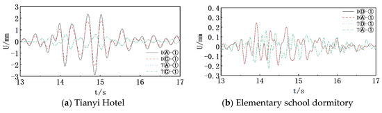 As shown in Figure 11b, the elementary school dormitory exhibits good synchronicity between y-direction and y-direction displacements, with no apparent phase difference. The maximum y-direction displacement for N1 and N2 is 0.12 mm, and the maximum x-direction displacement is 0.23 mm, with a displacement ratio of 1.0:1.0:1.9:1.9. It can be observed that there is no significant twisting of the model, and the y-direction displacements are smaller than those in the x-direction. Thus, it is determined that the model primarily moves in the x-direction. The displacement responses for the other working conditions of Tianyi Hotel and the elementary school dormitory are shown in Table 3.