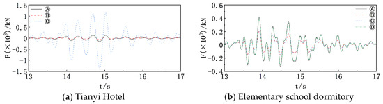 According to the base shear method, the maximum shear forces in a building occur at the ground level. This has been confirmed by both field damage assessments and numerical analyses. Using data from station SC.T2271 with PGA = 0.1 g as an example, the shear forces along each axis at the ground level are plotted in Figure 12. For Tianyi Hotel, the x-direction shear forces across the three axes are well-aligned, without significant phase differences. At 14.87 s, the shear forces reach their maximum values, with the x-direction shear forces for axes Ⓐ, Ⓑ, and Ⓒ being 150 kN, 70 kN, and 1340 kN, respectively. The ratio of these forces is 2.1:1.0:19.1, indicating that the shear forces on axes Ⓐ and Ⓑ are relatively close, while axis Ⓒ experiences the highest shear force: approximately 85.9% of the total shear. For the elementary school dormitory, the peak base shear is observed at 13.91 s, with the x-direction shear forces for axes Ⓐ, Ⓑ, Ⓒ and Ⓓ, being 420 kN, 210 kN, 210 kN, and 390 kN, respectively. The ratio of these forces is 2.1:1.0:1.1:2.0, showing that axes Ⓐ and Ⓓ have the largest shear forces, accounting for about 34.1% and 31.7% of the total shear, respectively. Compared to Tianyi Hotel, the elementary school dormitory withstands a PGA = 1.0 g seismic event more effectively. The shear force distribution across the axes in the dormitory is more uniform, with the maximum shear force percentage only reaching 34.6%, whereas Tianyi Hotel shows a greater disparity in shear force distribution, with the maximum reaching as high as 85.9%. This indicates that in Tianyi Hotel, the earthquake shear forces are highly concentrated on axis Ⓒ, leading to early damage to the vertical load-bearing components on this axis. In contrast, the more even distribution of shear forces in the elementary school dormitory prevents easy damage to its vertical load-bearing components, resulting in different performances under the same seismic conditions. These numerical results, consistent with the damage observations described in Section 1, also validate the rationality of the model establishment. Base shear responses for other working conditions of Tianyi Hotel and the elementary school dormitory are shown in Table 4.