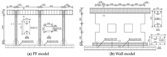 Based on the actual buildings, the models are constructed at a 1:3 scale ratio, as illustrated in Figure 13. The PF model consists of three frame columns and one loading beam, with the columns spaced 900 mm apart. Each column measures 130 × 130 × 1060 mm and contains four 8 mm diameter steel rebars. The rebars are embedded at the bottom into the baseplate and bent and anchored at the top into the loading beam. The concrete cover is 15 mm thick, and the stirrups are made from 2 mm diameter galvanized wire. The model wall is divided into three parts: the wall above the window (GTU), the wall below the window (GTD), and the wall between the windows (CJQ). Both the GTU and GTD have the same dimensions, 1800 × 380 × 80 mm, while the CJQ measures 300 × 300 × 80 mm. To meet the boundary conditions and experimental needs, both models have a loading beam at the top with dimensions of 2590 × 200 × 100 mm, containing two rows of rebars with three 6 mm diameter steel rebars per row. The stirrup setup in the loading beam is consistent with that in the PF model. Both models are cast in two bays simultaneously, allowing for cross-validation and the use of stacked weights to ensure vertical loading while eliminating the lag response of hydraulic jacks. This setup simulates the vertical load-bearing components of the ground floor of a multi-story building, with an axial compression ratio of 0.2 to mimic the stress conditions of actual multi-story structures.