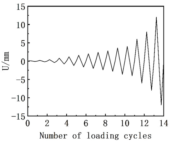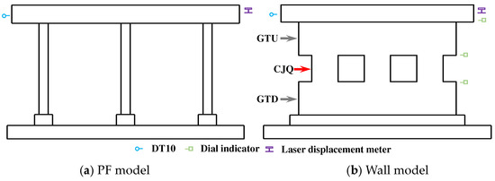 The experiment was conducted at the Key Laboratory for Building Failure Mechanisms and Mitigation under the China Earthquake Administration. The test utilized a displacement-controlled low-cycle reciprocating loading regime, divided into 22 stages: 0.1 mm, 0.2 mm, 0.4 mm, 0.8 mm, 1.2 mm, 1.6 mm, 2.0 mm, 3.0 mm, 4.0 mm, 6.0 mm, 8.0 mm, 12.0 mm, 16.0 mm, 20.0 mm, 24.0 mm, 28.0 mm, 32.0 mm, 36.0 mm, 40.0 mm, 50.0 mm, 60.0 mm, and 70.0 mm. To meet the requirements for loading rate, the loading frequency was appropriately adjusted: 0.1 mm to 2.0 mm at 0.05 Hz, 3.0 mm to 4.0 mm at 0.02 Hz, and 6.0 mm to 70.0 mm at 0.01 Hz. The experiment used an MTS 244.41 hydraulic servo actuator capable of a ±125 mm displacement range and a maximum load output of 500 kN. Two actuators were used for loading to eliminate torsional interference on the model. To eliminate disturbances such as sliding between the model and the loading plate, sliding of the model base, and deformation of the reaction frame, accurate measurement of the model’s actual deformation was ensured. Two sets of high-precision DT10 electronic displacement meters and two sets of LK-G500 laser displacement meters were installed at both ends of the loading beam. In addition, a set of micrometers was placed at the top of each of the three parts of the model wall to capture deformation in each section. The model loading regime and displacement measurement setup are illustrated in Figure 14 and Figure 15.