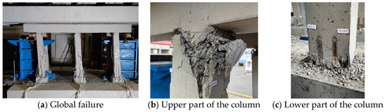 At a loading condition of 6.0 mm, horizontal cracks appeared at the top and bottom ends of the PF model (frame column), and as the loading conditions intensified, these cracks gradually extended. By the time the load reached 20.0 mm, the cracks had connected to form ring-shaped cracks; a phenomenon also observed at the base of the columns. The presence of ring-shaped cracks at both ends of the columns indicated the formation of plastic hinges. Between the conditions of 24.0 mm and 36.0 mm, the damage at the plastic hinges of the column ends progressively worsened. At a loading of 40.0 mm, the protective concrete layer at the column ends began to spall, and as the displacement increased, this spalling became more severe, with the internal reinforcement bars becoming exposed. At a displacement of 70.0 mm, the core concrete within the column peeled off significantly. Under the influence of gravity, the stirrups snapped, and the longitudinal rebars bulged outward in a lantern shape. The load had decreased by more than 85% of the maximum bearing capacity, prompting the cessation of the experiment. Throughout the experimental procedure, the PF model exhibited a typical bending failure. The final failure mode of the PF model is illustrated in Figure 16.