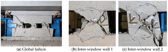 At lower loading conditions, the model deformation was minimal, and the model remained in the elastic phase. At a loading of 3.0 mm, due to stress concentration, cracks first appeared at the corners of the walls between the windows. From 4.0 mm to 6.0 mm, some of these cracks extended and penetrated through, effectively segmenting the model into several parts. At 8.0 mm, diagonal shear cracks appeared in the sections of wall between the windows, and these cracks extended rapidly. Within this loading condition, the diagonal cracks had completely penetrated the entire wall section, resulting in significant shear damage. The test was unable to proceed beyond 12.0 mm as the model collapsed; the loading beam and the protective devices came into close contact, necessitating the termination of the experiment. It was observed that the damage was primarily concentrated in the wall sections between the windows, with the cracks causing these parts of the wall to form wedge-shaped bodies. In comparison to the PF model, the wall model exhibited brittle shear failure, with more severe damage and no significant displacement observed during the loading process. Figure 17 displays the final state of damage in the wall model.