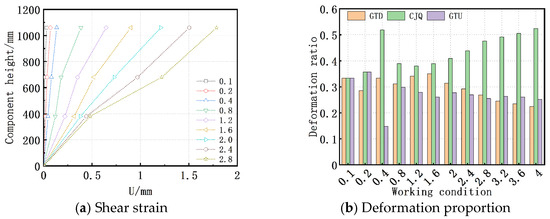 Based on the experimental observations, the three sections of the wall model primarily experienced shear deformation. The deformations of each section are depicted in Figure 18. At lower loading levels, the lateral shifts in all three sections were minor, with the CJQ (the wall between the windows) section experiencing the largest deformation, although the differences among the three sections were relatively small. As the displacement increased, the deformation of each section also increased, with the CJQ section showing the greatest deformation, accounting for 40–50% of the total deformation. The disparity between the CJQ section and the other two sections gradually widened, indicating that deformation in the wall model was concentrated in the CJQ section, which determined the model’s limit of deformation.