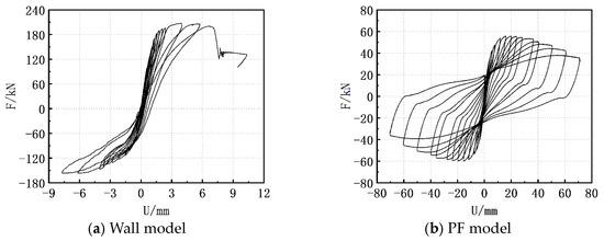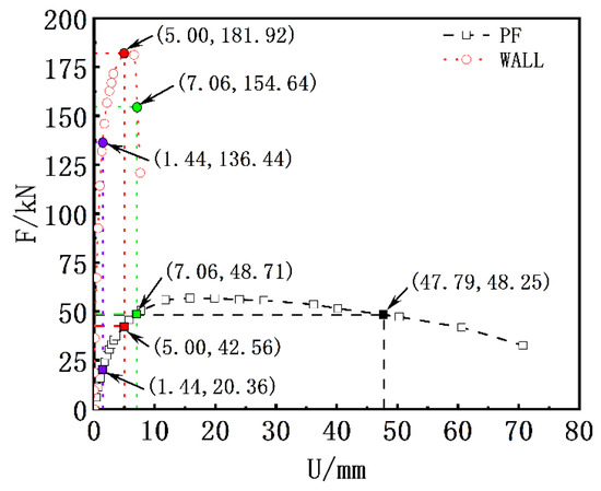 Figure 21 illustrates the skeleton curves for the wall and PF models. At small displacements, both models are within the elastic range, with the wall model exhibiting a greater initial stiffness than the PF model. At a displacement of 2.55 mm, the wall model shows crack formation, corresponding to a cracking load of 162.69 kN. The PF model begins to crack at a displacement of 5.76 mm, with a corresponding load of 45.54 kN. Using graphing methods [47], the yield, peak, and ultimate loads for the PF model are identified as 42.56 kN, 56.75 kN, and 48.23 kN, corresponding to displacements of 5.00 mm, 15.80 mm, and 47.79 mm, respectively. The inter-story drift ratios for these displacements are 1/212, 1/67.1, and 1/22.2. Even at a displacement of 70 mm, the PF model does not experience substantive collapse. For clarity in comparing the two models, a displacement of 47.79 mm is defined as the collapse displacement for the PF model according to the literature [47]. As the displacement increases, the load for the wall model rises more rapidly. Its yield, peak, and ultimate loads are 136.44 kN, 181.92 kN, and 154.64 kN, corresponding to displacements of 1.44 mm, 5.00 mm, and 7.06 mm, respectively. The inter-story drift ratios are 1/736.1, 1/212, and 1/150.1. The wall model collapses at a displacement of 7.62 mm—close to the displacement at peak load capacity—indicating that after reaching peak load, the model suffers significant damage, and the load capacity rapidly declines. It is worth noting that the PF model did not yield when the wall model was destroyed. Compared to the PF model, the wall model has smaller key displacement points and displacement changes in its skeleton curve, allowing the displacement at peak load to be considered the trigger point for collapse. Comparing the skeleton curves of the two models, the PF model has a lower lateral stiffness and load-bearing capacity but a larger ultimate displacement and better ductility, displaying “weak ductile” characteristics. It exhibited ductile bending failure during testing. In contrast, the wall model has higher a lateral stiffness and load-bearing capacity but smaller ultimate displacement and poorer ductility, showing “strong brittle” characteristics. It exhibited brittle shear failure during testing.