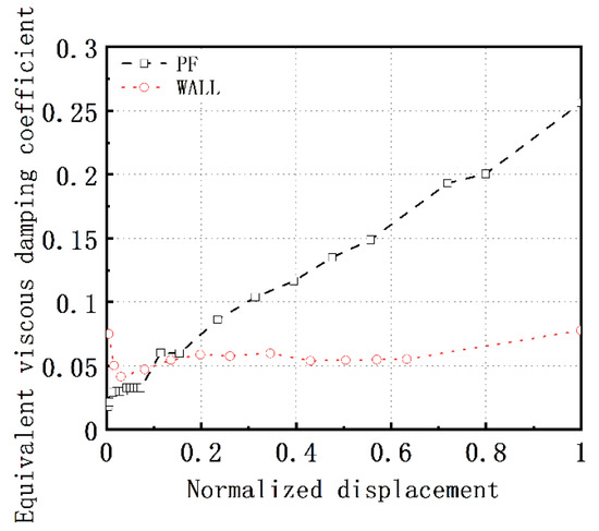As illustrated in Figure 19 and Figure 20, for the wall model, the area of the hysteresis loops is relatively small under small loading conditions, but its energy dissipation capacity is stronger than that of the PF model. When the displacement approaches the limit of 13%, the energy dissipation capacities of the two models become similar, with an equivalent viscous damping coefficient of about 0.05. As the displacement further increases, this coefficient does not show a significant increase, reaching a maximum of about 0.08, corresponding to a displacement of about 75% of the limit displacement. For conditions ranging from 0.1 mm to 2.0 mm, the PF model also exhibits small hysteresis loop areas and a weaker energy dissipation capacity, with the equivalent viscous damping coefficient generally being maintained between 0.02 and 0.03, indicating that the model is nearly in an elastic state. As the displacement increases, the area of the hysteresis loops gradually enlarges, and its capacity to dissipate energy is enhanced. It is observed that at a condition of 16.0 mm, the PF model reaches its maximum load-bearing capacity, with an equivalent viscous damping coefficient of 0.03. In the 50.0 mm condition, the PF model reaches its collapse displacement. The reason for the difference in energy dissipation capacities between the two models is due to their deformation characteristics. The wall model primarily undergoes shear deformation, ultimately leading to brittle failure. In contrast, under small loading conditions, the columns of the PF model are in the elastic phase and dissipate less energy. As the displacement increases, plastic hinges successively appear at both ends of the columns and develop fully with increasing displacement, eventually resulting in ductile bending failure.