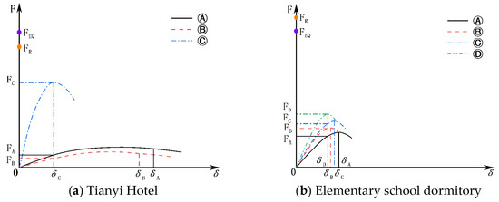Due to differences in functional use, construction methods, and other factors, the force–displacement curves for different axes can vary significantly. Based on the curves obtained from the experiments described in this article, a combination is formed and representative buildings are identified, as illustrated in Figure 23 and Table 7, where δ1 represents the lateral displacement generated by the structure. The first category is the “weak ductile + strong brittle” combination, represented by PF + wall, with an example building being Building 7, Group 1 in Detuo Town. This building displays “asymmetry” characteristics, where there is a significant difference in the lateral stiffness between the axes, and the deformation saturation point of axis Ⓒ is smaller than that of axis Ⓐ. The structure is prone to damage and even collapse; thus, the collapse displacement trigger point depends on axis Ⓒ. The second category is the “strong brittle + strong brittle” combination, represented by wall + wall, with the former Minya Konka school dormitory as an example. This building has similar structural configurations across its axes and minor differences in lateral stiffness, presenting “uniform” characteristics. Therefore, the distribution of seismic forces is relatively similar across all axes. The third category is the “weak ductile + weak ductile” combination, represented by PF + PF, exemplified by a certain under-construction frame structure. As this type of structure lacks non-structural components such as internal walls, the lateral stiffness across the axes is quite balanced, showing “uniform” characteristics. Moreover, each axis has a larger ultimate displacement, making it difficult for the vertical load-bearing components to reach their deformation saturation points, and no significant damage occurs in these buildings.