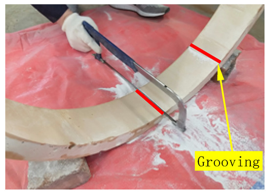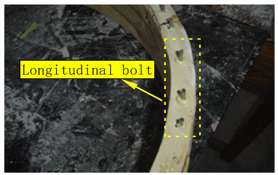 The segment model was made according to the similarity ratio, and the similar materials were made according to the ratio of fixed water–gypsum = 1:1.4. The shield tunnel segment joint was simulated to understand the special link between the segment and the ring indirect head of the shield tunnel. For the joint form of the longitudinal joint of the segment, the longitudinal joint is simulated by slotting. A certain depth of slot is cut in the model ring corresponding to the part of the tunnel joint to weaken the bending stiffness of the part. The slot depth is determined by the equivalent bending stiffness of the prototype joint [34]. To join the segment ring to the ring and simulate the indirect head of the segment ring, we used a bolt with a diameter of 4 mm and a length of 20 mm at the indirect head of the model ring. The simulation measures at the model joint are shown in Figure 2 and Figure 3.