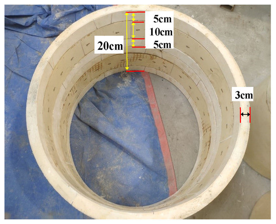 The segment similarity model is created by vertically superimposing the segment in the form of one full ring and two half rings (1/2 + 1 + 1/2). The model’s overall height is 20 cm (the whole ring is 10 cm high, the half ring is 5 cm), its outer diameter is 0.38 m, and its inner diameter is 0.35 m, as illustrated in Figure 4.