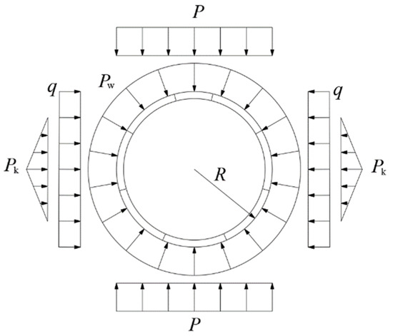 For the underwater shield tunnel, set the load mode [35] as shown in Figure 5. In the figure, is the radius of the tunnel. is the vertical earth pressure. is the horizontal earth pressure. is the water pressure and is the ground resistance. The water pressure is simulated by hoop force. The concentrated stress force is used to approximately simulate the earth pressure. The concentrated pull force perpendicular to the vertical earth pressure is used to introduce the formation resistance.