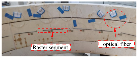 In this experiment, the information acquisition form of a surface-mounted FBG sensing element combined with a wavelength demodulator was adopted. The distributed sensor network was formed in the form of circumferential distribution along the inner surface of the segment, and the overall deformation information of the segment structure was accurately and automatically perceived in real time. To fully monitor the tunnel segment for more information, considering the relationship between the length of the optical fiber substrate and the size of the segment, we consider the 18° uniform layout of FBG sensing elements. According to the needs of general engineering monitoring and previous research [34], under the requirements of accuracy and cost, the traditional four-point supplementary layout method is selected. According to the difference between the above two layouts, the third layout is selected as a 36° uniform layout. Therefore, this experiment will use three kinds of distribution methods, and investigate the influence of different distribution methods for surface-mounted FBG sensing elements in the local monitoring of tunnels. The first is an 18° uniform layout mode, in which the FBG sensing element is uniformly arranged in a ring direction on the inner surface of the tube segment, the element’s length is chosen to be 8 cm, the ring direction is arranged in a total of 20 elements, and the angle spacing of the element is 18°. The second is a 36° uniform layout mode, in which the component lengths are placed ten times in a ring pattern with a 36° angle between them. The third option is the traditional four-point supplementary layout, in which one measuring point is placed in the vault, one in the bottom of the arch, one in each of the left and right arches, and two more are placed between the four points at angles of 18 degrees and 36 degrees, respectively. In order to eliminate the influence of temperature effect on fiber grating, a temperature compensation fiber is placed near the remaining idle segments. The layout of FBG sensing elements is shown in Figure 9.