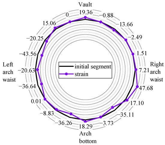 According to Figure 12, when subjected to a 322 N circumferential uniform load, the segment’s inner surface experienced a maximum tensile strain of 19.36 με and a maximum compressive strain of 35.11 με. The tensile and compressive strain are not axisymmetric, contrary to Layout 1’s finding. The tunnel’s general deformation law is the same as Layout 1. It is worth noting that the maximum tensile stress monitored by Layout 1 and Layout 2 is different. In particular, with underwater pressure load and no formation load, the maximum tensile stress of Layouts 1 and 2 is 47.68 MPa and 17.10 MPa, respectively. Layout 1 and Layout 2 have essentially the same maximum compressive stress. In general, the segment lining deforms symmetrically. The top and bottom of the arches contract inward, while the arches on both sides expand outward. Eventually, elliptical distortion can be seen in the segment lining.