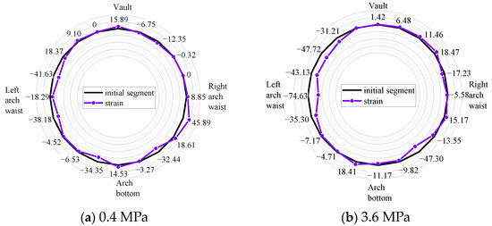As seen in Figure 10, when subjected to a 322 N circumferential uniform load, the segment’s inner surface experienced a maximum tensile strain of 43.56 με and a maximum compressive strain of 47.68 με. As seen in Figure 11a,b, under the condition of circumferential, uniform water pressure load, the tensile and compressive strains of the segment structure gradually increased again as the formation pressure increased from 0.4 MPa to 3.6 MPa. In general, the strain variation of the segment model is small in the early stage of stratum load loading. Under uniform water pressure, compressive strain occurs on the inner surface of the segment model. The circumferential compressive strain inside the model structure increases. On the whole, the segment has a tendency to shrink inward. The presence of water pressure lessens the strain on the segment lining structure, and its distribution is advantageous to the structure within its permissible range. The strain distribution of the segment exhibits a significant increase when the test loading device is loaded with a 3.6 MPa formation load. The strain on both sides of the segment arch is shifted inward, and the offset gradually increases.