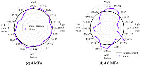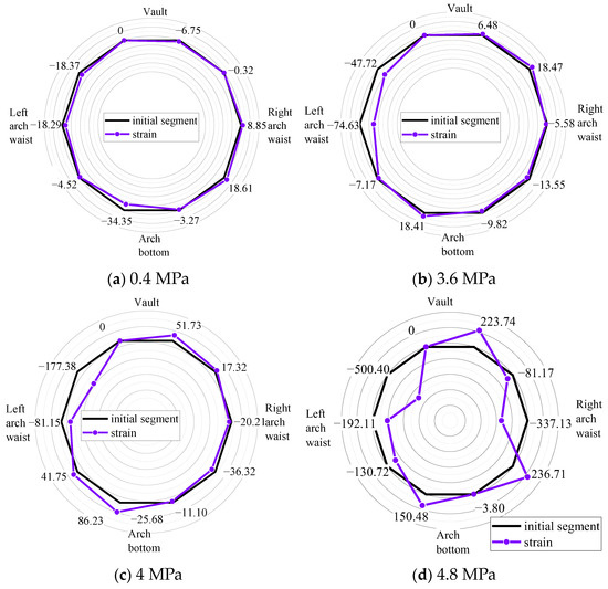 As shown in Figure 14 and Figure 15, under the action of 322 N circumferential uniform load, the maximum tensile strain on the inner surface of the segment model is 19.36 με, and the maximum compressive strain on the surface is 35.11 με. Different from the results of Layout 1, the tensile and compressive strains are not axially symmetrical. As shown in Figure 15 a, d, the maximum compressive strain is 32.44 με, which lowers by 2.67 με when the hydraulic device value increases from 0 to 0.4 MPa. The maximal tensile strain is 15.89 με, which decreases by 3.47 με. The maximum tensile and compressive stress in Layout 3 is the same as that in Layout 1 when the ground load is between 3.6 and 4.8 MPa. The arch top and arch bottom contract inward and the arch waist expands outward on both sides during the deformation of segment lining, which often takes the form of a symmetrical elliptical deformation. Due to the different monitoring arrangements, the measured deformation positions of the tunnel are different, and the deformation of each point of the tunnel is also different. This also leads to differences in measurement data under different monitoring arrangements for the same loading mode. However, the tunnel deformation law of the overall monitoring is the same.