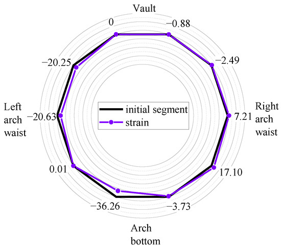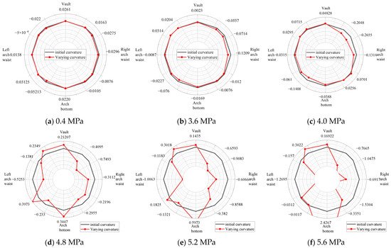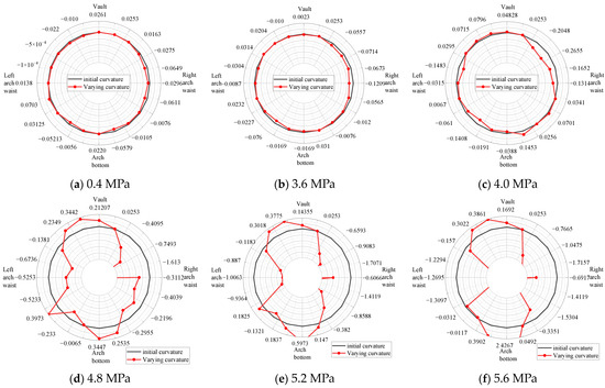 As seen in Figure 17a,b, at this point, formation pressure gradually affected the segment. The inner surface of the segment exhibited primarily negative curvature growth changes, indicating that more pressure strain occurred inside the model’s structure, and the segment as a whole displayed a trend of inward contraction and deformation. In the early stages of formation loading, the segment curvature does not vary much. The curvature of the segment dramatically alters when the test loading device is loaded with a 3.6 MPa formation load, as shown in Figure 17c–f. The segment’s highest curvature, with 4.8 MPa ground load, is 0.3973 m−1, while its smallest curvature is −1.613 m−1. This is because as ground load increases, the segment’s curvature on both sides of the arch waist grows negatively, indicating an outward displacement, while the segment’s curvature in the vault and arch bottom area grows positively, indicating an inward displacement.