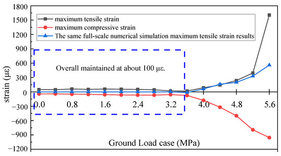 The maximum tension and compression strains under each load in Layout 1 were utilized as the primary reference indices to construct the segment load–strain curve, appropriately showcasing the structure’s deformation state. As demonstrated in Figure 16, the maximum compressive strain of the segment lining structure steadily rises, from −41.63 με to −74.63 με, a 73% increase, when the ground load is in the range of 0–3.6 MPa. The maximum tensile strain initially rises and then gradually falls to around 50 με. The segment structure’s maximum compressive and tensile strains rose sharply between 3.6 MPa and 4.8 MPa, with the compressive strain rising by 481% from 74.63 με to 433.43 με. Following the formation load of 4.0 MPa, the segment structure deforms rapidly. The portion has fissures, which eventually progress gradually. Finally, the structure sustains extensive damage from numerous secondary cracks that grow and penetrate.