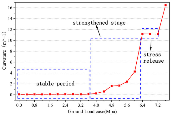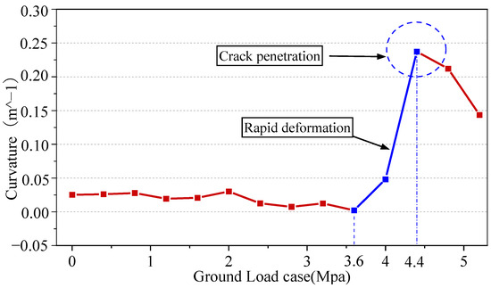 In the load range of 0–3.6 MPa, Figure 21 shows that the segment measuring point arch’s curvature steadily reduces. The fracture was broken through and the structure tension was released when the vertical formation load was 4.4 MPa; the curvature of the arch abruptly decreased (slope 0.3), indicating that the fracture had finally occurred.