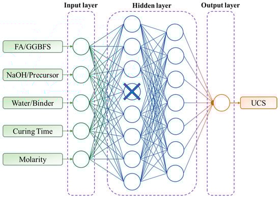 Furthermore, to address the issue of overfitting that may arise during training, a Dropout layer is introduced into the neural network. In the training progress, a certain proportion of neurons will randomly output 0 due to this layer. This configuration reduces the network’s complexity while enhancing the model’s capacity []. Since the current study aimed to predict the UCS value, the output layer was typically set to a single neuron.