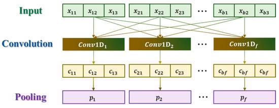 A conventional CNN model is composed of the five layers: Convolutional layers, Pooling layers, Activation layers, Normalization layers, and Dense layers. The key of the CNN structure is the Convolutional layers. Adjusting the filter and kernel_size parameters in the 1D Convolutional layer can yield different effects on the feature extraction. The filter parameter determines the number of Convolutional kernels used to operate on the input data, while the kernel_size parameter plays a significant role in CNN performance. A larger kernel_size can capture broader features, while a smaller one can capture finer details. The purpose of the Pooling layer is to reduce dimensionality and accelerate the computation of the results from the Convolutional layer. Average pooling retains the overall feature information, while max pooling preserves local detailed features. As illustrated in Figure 2, for a tensor with input shape and setting filters, a three-dimensional tensor of shape is obtained, which is then dimensionally reduced by the Pooling layer to output a two-dimensional tensor of shape .