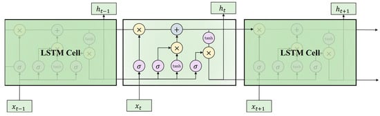 The recurrent neural network (RNN) has a greater advantage in handling time series data compared to the neural networks by using Dense layers and Convolutional layers [,]. The RNN is derived from the BPNN by adding a recurrent core to enhance short-term memory. In its recurrent structure, each neuron is determined not only by the parameters of the current input but also includes the output of the hidden layer from the previous time step. However, the traditional RNNs may encounter the vanishing or exploding gradient problem when dealing with long sequences, causing unstable training, an inability to increase network depth, and difficulty in effectively capturing long-range dependencies.
