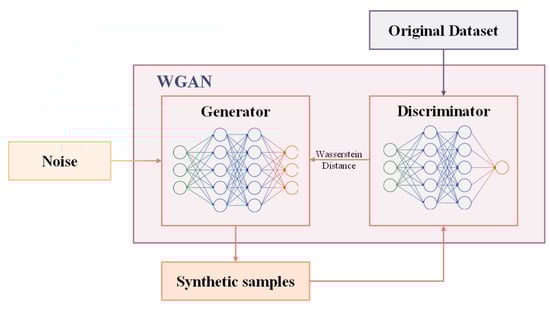 Generative Adversarial Network (GAN), formally introduced in 2014 [], consists of two neural network structures, the Generator and the Discriminator, as depicted in Figure 4. Through the adversarial interplay between these two networks, GAN can generate synthetic data. The Generator learns the distribution of real samples and then produces a series of synthetic samples, while the Discriminator distinguishes between synthetic samples generated by the Generator and real samples. The basic GAN model is prone to the issue of mode collapse, in which the Generator tends to generate a small number of high-quality synthetic samples in a narrow range. As these synthetic samples approach the real distribution, they can receive high scores from the Discriminator, inducing poor diversity and the concentration of generated synthetic samples within a small range [,]. Thus, various improved networks have been derived from GAN to address the mode collapse, such as the Wasserstein Generative Adversarial Network (WGAN) [], Deep Convolutional Generative Adversarial Network (DCGAN) [], and Cycle-Consistent Adversarial Network (CycleGAN) [].