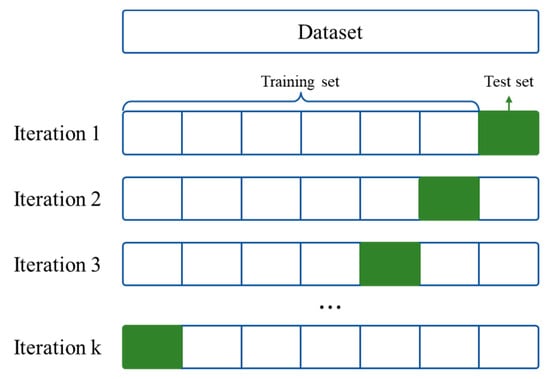 K-Fold cross-validation is a common method to validate and evaluate the performance of models []. The basic idea is to divide a dataset into groups, in which groups are used as the training set for model training and the remaining group is taken as the test set for model testing and validation, as illustrated in Figure 5. This process results in models, in which the average results are taken as the final performance of the model. K-Fold cross-validation can extract as much valuable information as possible from limited data, thereby avoiding poor model performance due to the uneven distribution of the training set, and can further reduce the likelihood of overfitting and increase the stability of the model. Most studies recommend using 5-fold or 10-fold cross-validation to obtain the final model results [,]. In this study, 5-fold cross-validation was chosen, with the average values of each metric taken as the final conclusion.