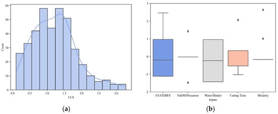 Description of the data distribution. (a) Histogram of the UCS. (b) Box diagram of the inputs.
