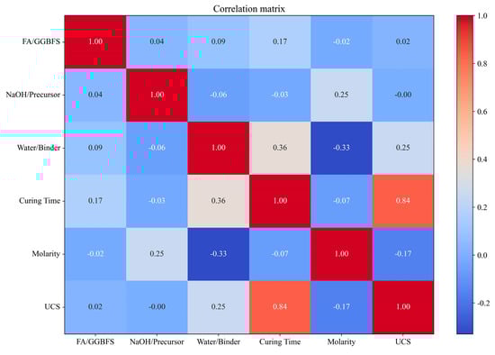 The statistical description of the dataset is presented in Table 2, with corresponding visual representations in Figure 7 (histogram and box diagram). Figure 7a displays the distribution of UCS in a histogram. Figure 7b illustrates the distributions of the five input variables after standardization. The box diagram in Figure 7b shows that the distributions of NaOH/precursor and molarity are relatively discrete. The linear correlation coefficient was computed to clarify the relationships among the variables, as presented in Equation (16) and illustrated in Figure 8.