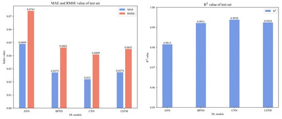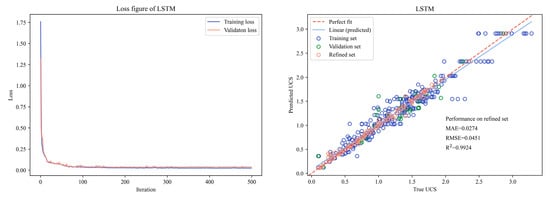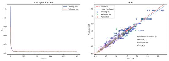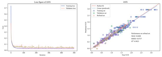 The performance results and error analyses of the four DL models are shown in Figure 9, Figure 10, Figure 11, Figure 12, Figure 13 and Figure 14. From the loss figures in Figure 9, Figure 10, Figure 11 and Figure 12, it can be observed that the loss functions of all four DL models converged. In comparison to the other models, the loss figure of the ANN in Figure 9 shows that the loss for the validation set did not completely approach 0, but exhibited some fluctuations. This is likely due to the absence of a backpropagation algorithm in the ANN to adjust the parameters of the preceding neural network units, which caused the model’s predictions for the refined set to not be completely concentrated on the best fit line.