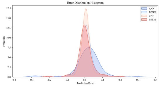 The Kernel Density Estimation (KDE) plots of the four models, which are presented in Figure 14, can be used to analyze the distribution of errors for each model. It is evident that the errors for the CNN model were most concentrated around 0, followed by the LSTM, which had smaller errors compared to the BPNN, and the ANN gave the largest errors among the four models. Based on the above analysis, the CNN model had better performance than the other DL models in the present study.