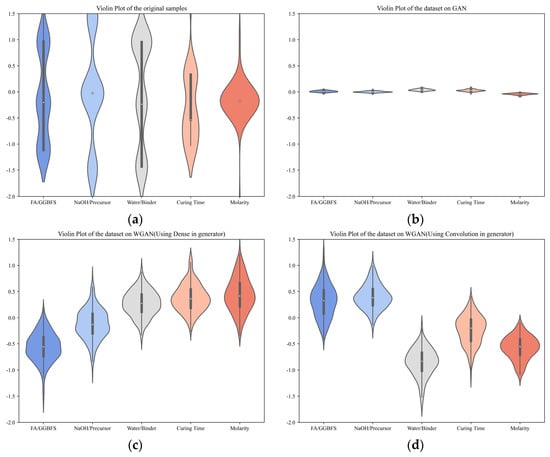 Firstly, standardized preprocessing was applied to the source data, and then violin plots were generated using synthetic samples distributed by GAN and WGAN (Dense layers [] and Convolutional layers []), as shown in Figure 15. The distribution of input variables in the original dataset is shown in Figure 15a. Based on Figure 15b, it can be observed that using GAN alone induced model collapse, in which the generated synthetic samples were concentrated within a small range and failed to effectively capture the distribution of the original data samples. At the same time, the WGAN generator with Dense layers, as shown in Figure 15c, can extract more diverse features, and the WGAN generator with Convolutional layers, as shown in Figure 15d, can capture a complementary distribution. Obviously, the combination of the generator with dense and Convolutional layers can have more comprehensive, synthetic data, compensating for the lack of distribution in some ranges. Taking the input variable of curing time as an example, the original data only included the UCS at 3, 7, 14, and 28 curing days. Through the combination of the synthetic data from the WGAN generators with Dense and Convolutional layers, the data for the UCS within a month can be obtained, further expanding the distribution for the training set.